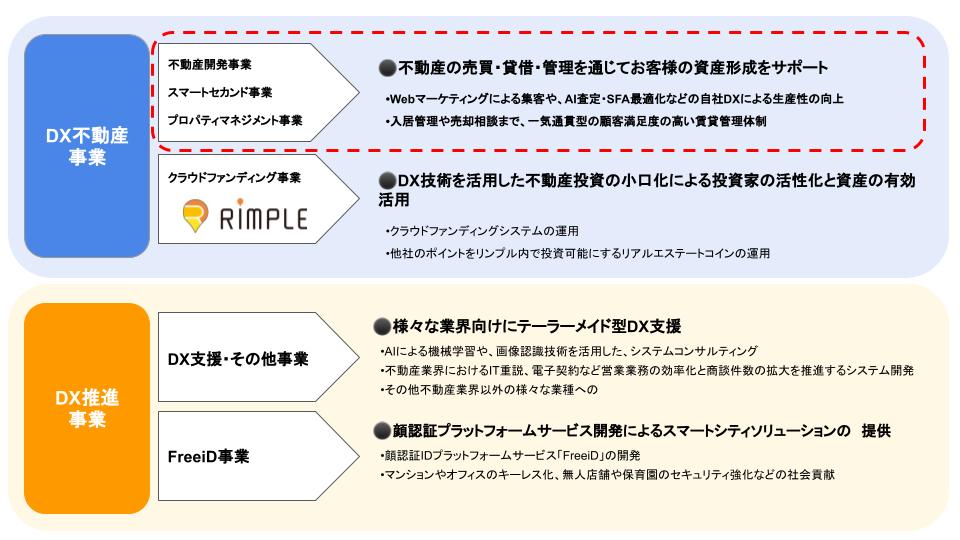 プロパティーエージェントは、不動産の実売、物件管理支援及びクラウドファンディング事業を束ねるDX不動産事業と、DX支援・顔認証プラットフォーム開発等を行うDX推進事業の2つの事業から構成されています。今回、同社の不動産投資セミナーに該当するセクションは、赤い点線の囲みにある、不動産開発事業、スマートセカンド事業、プロパティマネジメント事業、この3事業が主な対象になります。